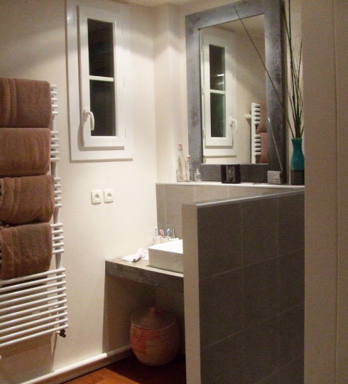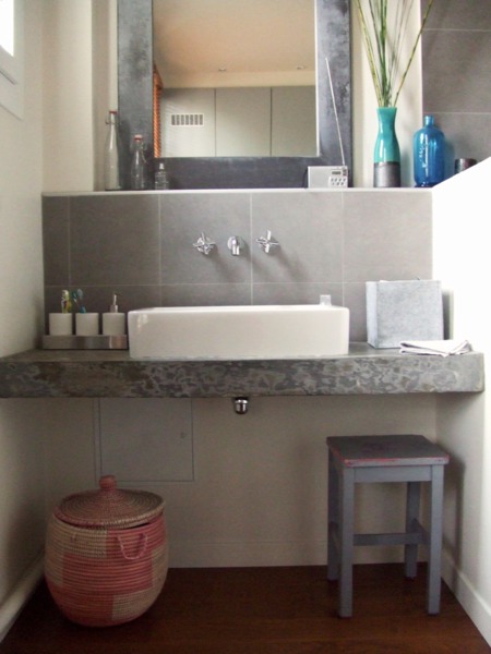 enfants et à la salle de bains se faisant par un panneau coulissant à galandage toute hauteur qui s'inscrit dans le prolongement du mur de l'entrée.
