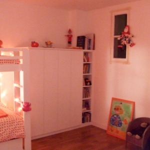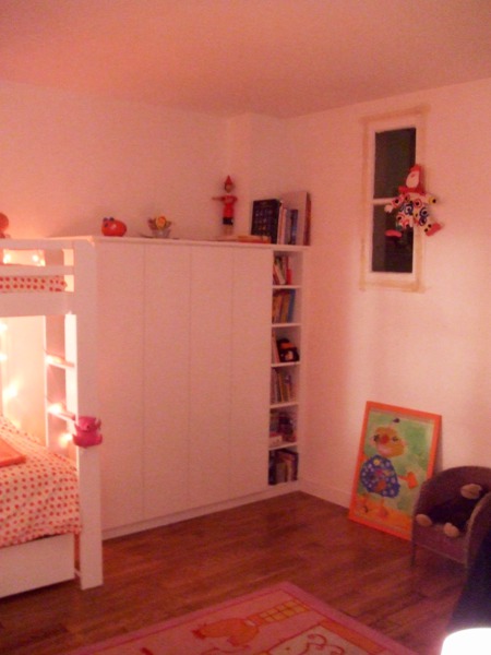 Ces différents espaces se dévoilent dans un deuxième temps; la porte de la chambre des parents étant "dissimulée" derrière les panneaux de la cuisine (porte tapissière) et l'accès à la chambre des