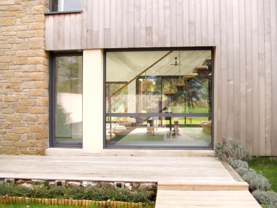 dimensions permet d'ouvrir au maximum la maison sur le jardin, et même lorsque les baies sont fermées, le jardin semble faire partie du décor intérieur. Ces baies vitrées sont de véritables tableaux