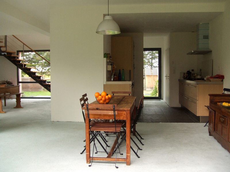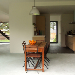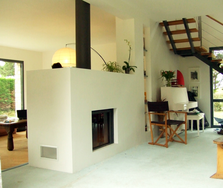 Les pièces de vie au rez-de-chaussée sont réparties sur un volume complètement ouvert; les différents espaces sont délimités par des éléments permettant de créer des zones, comme la cheminée qui