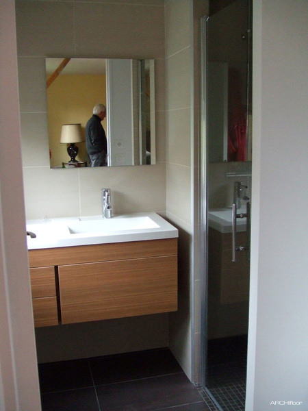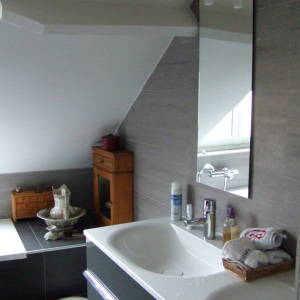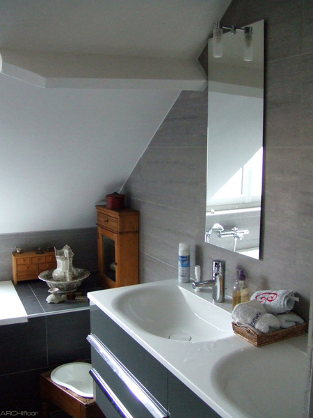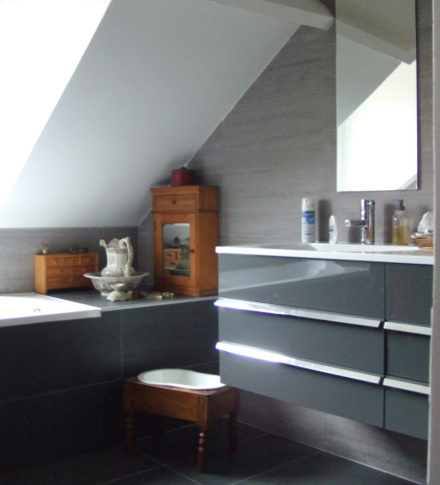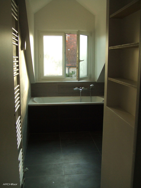 Au 1er étage, les WC attenants ont été diminués pour donner plus d'espace à la salle de bains et pouvoir créer une grande douche à l'italienne ouverte. La baignoire a pris place sous la fenêtre et les rampants. Un soin particulier a été apporté au calepinage des 2 salles de bains; une dans les tons de gris l'autre dans les tons beiges. Au 1er étage, le sol semble se retourner sur le tablier de la baignoire...